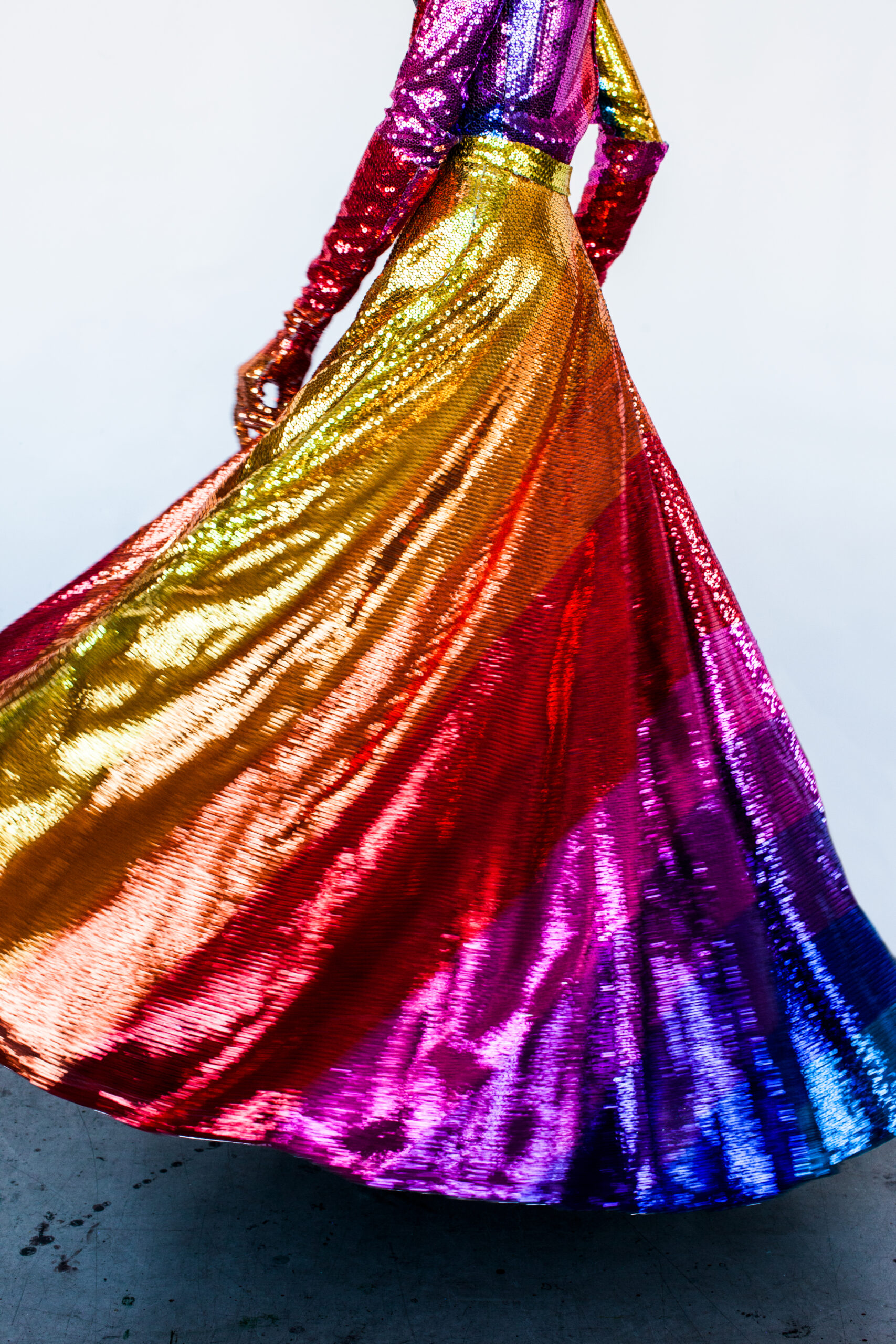 My topic was futurism in the 60s and race cars. The metallic surface of the cars inspired me to use the shiny sequins as a base for the prints. A 60s sequin dress from the Geoffrey Beene collection was a major inspiration for me. I did a lot of research and experiments with pressing, which is most commonly used in sportswear, and I realized that sequins are my material. I wanted to get rid of everything that is cold and harsh, so the prints had to be as sharp and simple as possible. All elements of the collection had to be very stripped-down and minimalistic, which is slightly questionable when it comes to sequins.