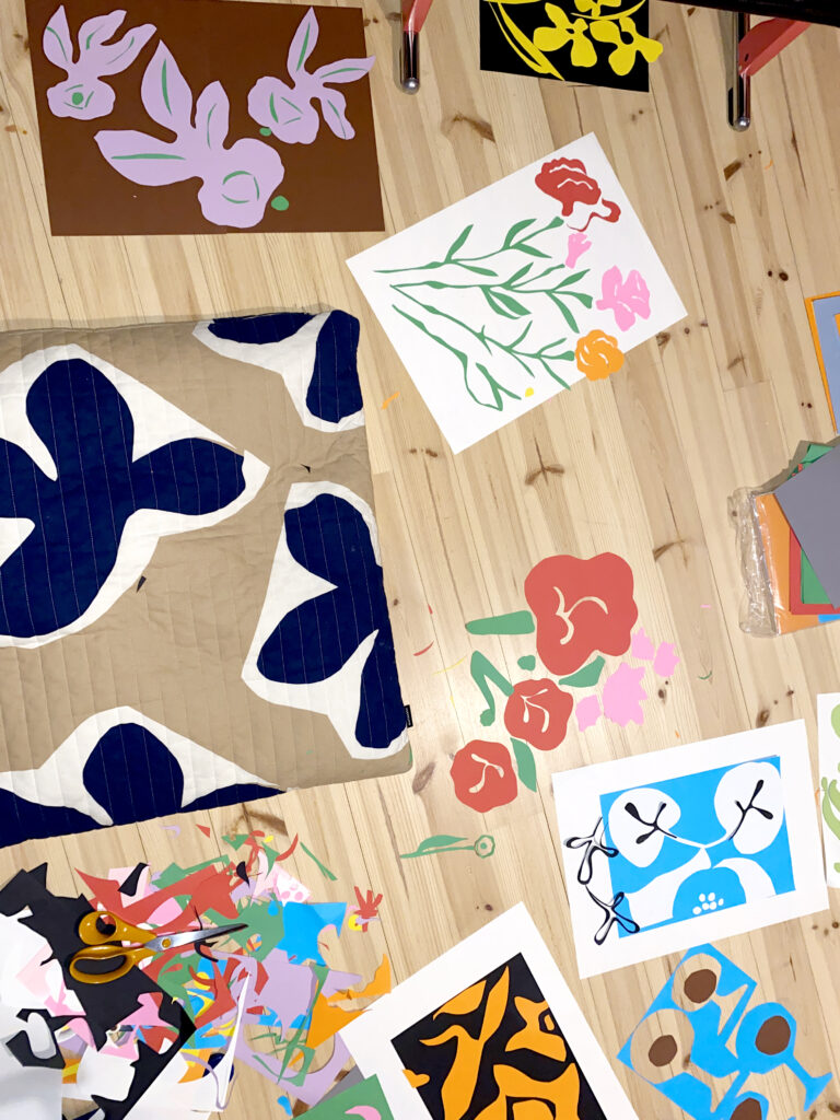 Työskentelen melkein aina kotoa käsin. Istun mieluiten lattialla, koska voin levittää paperini laajalle alueelle ja työskennellä usean luonnoksen parissa yhtä aikaa. Kollaasini ovat aina käsin tehtyjä. Pidän käsillä työskentelystä, koska koen sen antavan lopputulokselle orgaanisemman laadun.