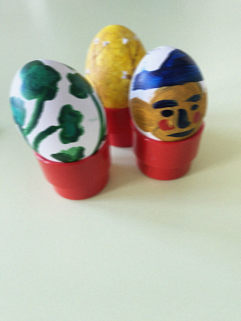 Vuoden kohokohta on munien maalausilta, jolloin ystävät kokoontuvat maalaamaan pääsiäismunia. Minulla on laaja kokoelma ystävieni maalaamia munia, ja ne ovat suurin aarteeni. Kuvassa keskellä oleva muna on Ville Andersonin tekemä ja oikealla oleva Milja Havasin. Molemmat ovat loistavia taiteilijoita!